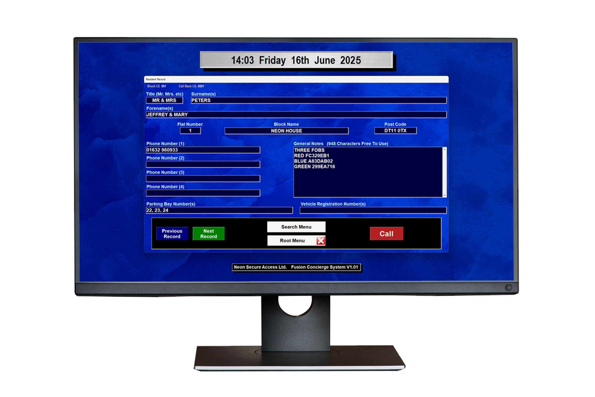 Neon’s concierge solutions bring all your building’s entry points together, allowing reception staff, caretakers or housing officers to answer calls, unlock doors, and communicate with residents from a single location. Whether you manage a tower block, sheltered accommodation or multi-block estate, our concierge modules are designed to integrate seamlessly with any Neon system and scale up to 999 blocks, managing lobbies, car park gates, barriers, communal areas, and lifts via a user‑friendly PC application.